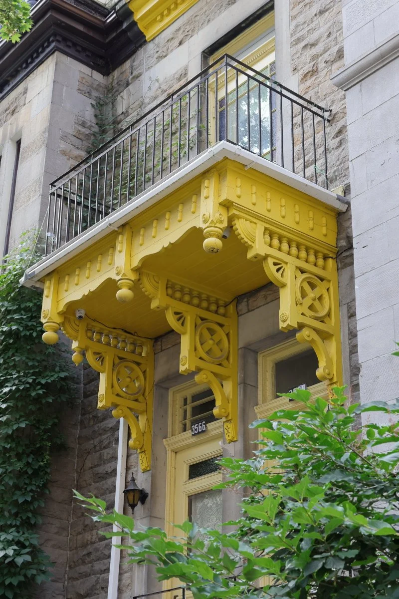 Sur la rue Hutchison, un balcon jaune éclaire la pierre et rappelle les jours où l’ornement était un geste ouvrier. Ce décor sculpté, vibrant et tenace, prolonge l’histoire de ceux qui bâtissaient autant pour durer que pour embellir.