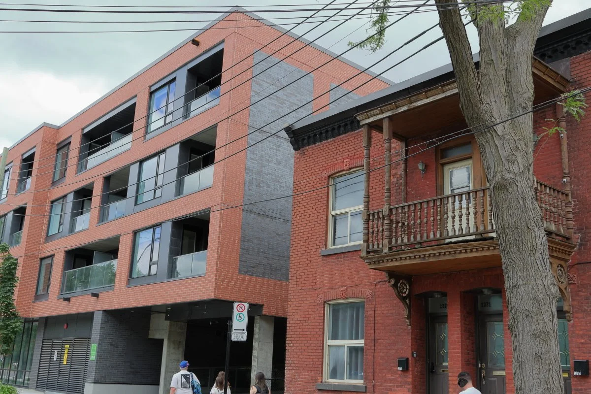 Face à un immeuble à condos tout juste construit, un balcon en bois sculpté rappelle le passé ouvrier de la Pointe. Accroché à la brique ancienne, il témoigne d’une mémoire tenace, encore visible dans les interstices du quartier. Rue Ropery, au coin de la rue Saint-Patrick.