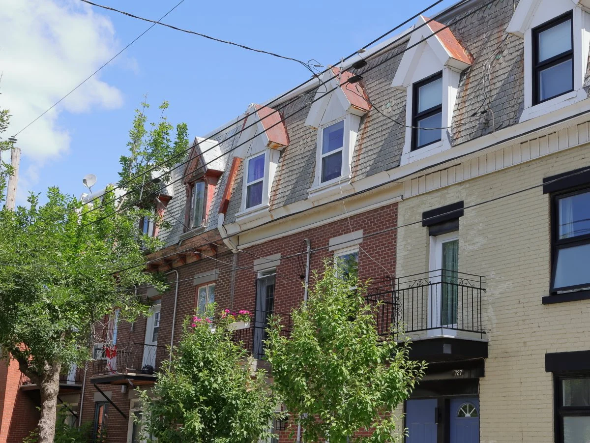 Maisons ouvrières typiques de Pointe-Saint-Charles, construites en rangée avec toits mansardés, lucarnes et balcons en fer forgé. Ces habitations de brique témoignent du développement rapide du quartier vers la fin du XIXe siècle. Rue Hibernia, coin Rozel, côté est.